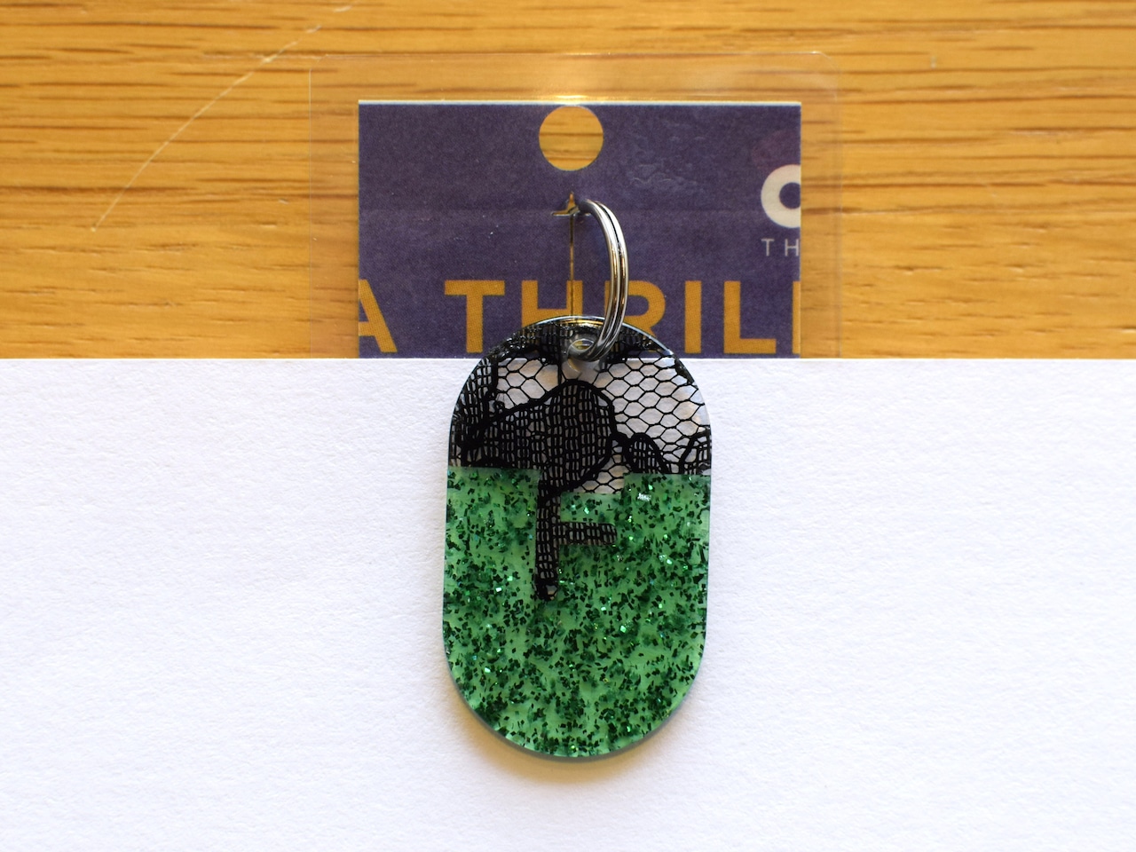 色柄が特徴的な装飾端材を使用してつくられたアクリルタグのキーホルダー。