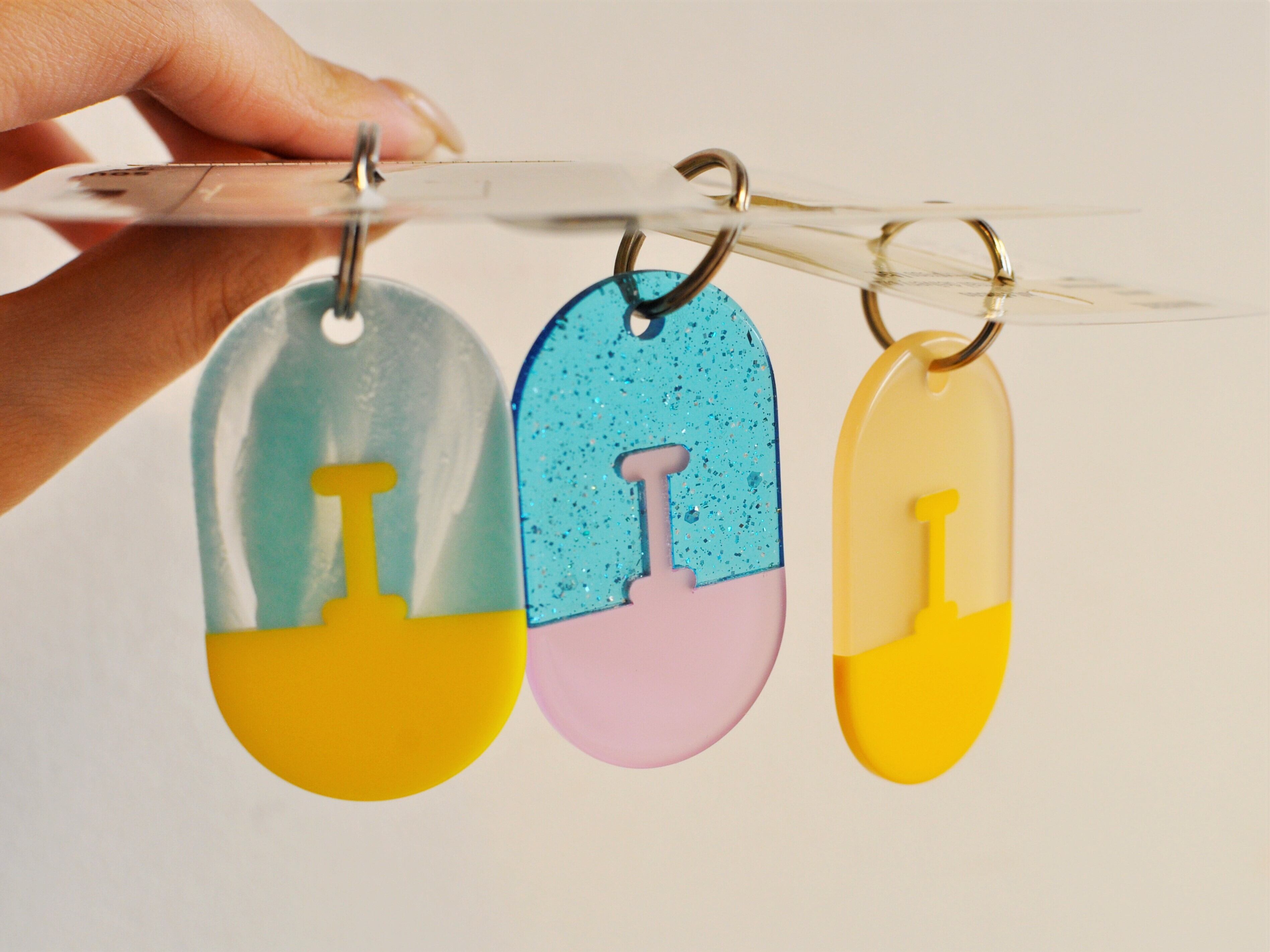 色柄が特徴的な装飾端材を使用してつくられたアクリルタグのキーホルダー。