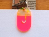 色柄が特徴的な装飾端材を使用してつくられたアクリルタグのキーホルダー。