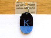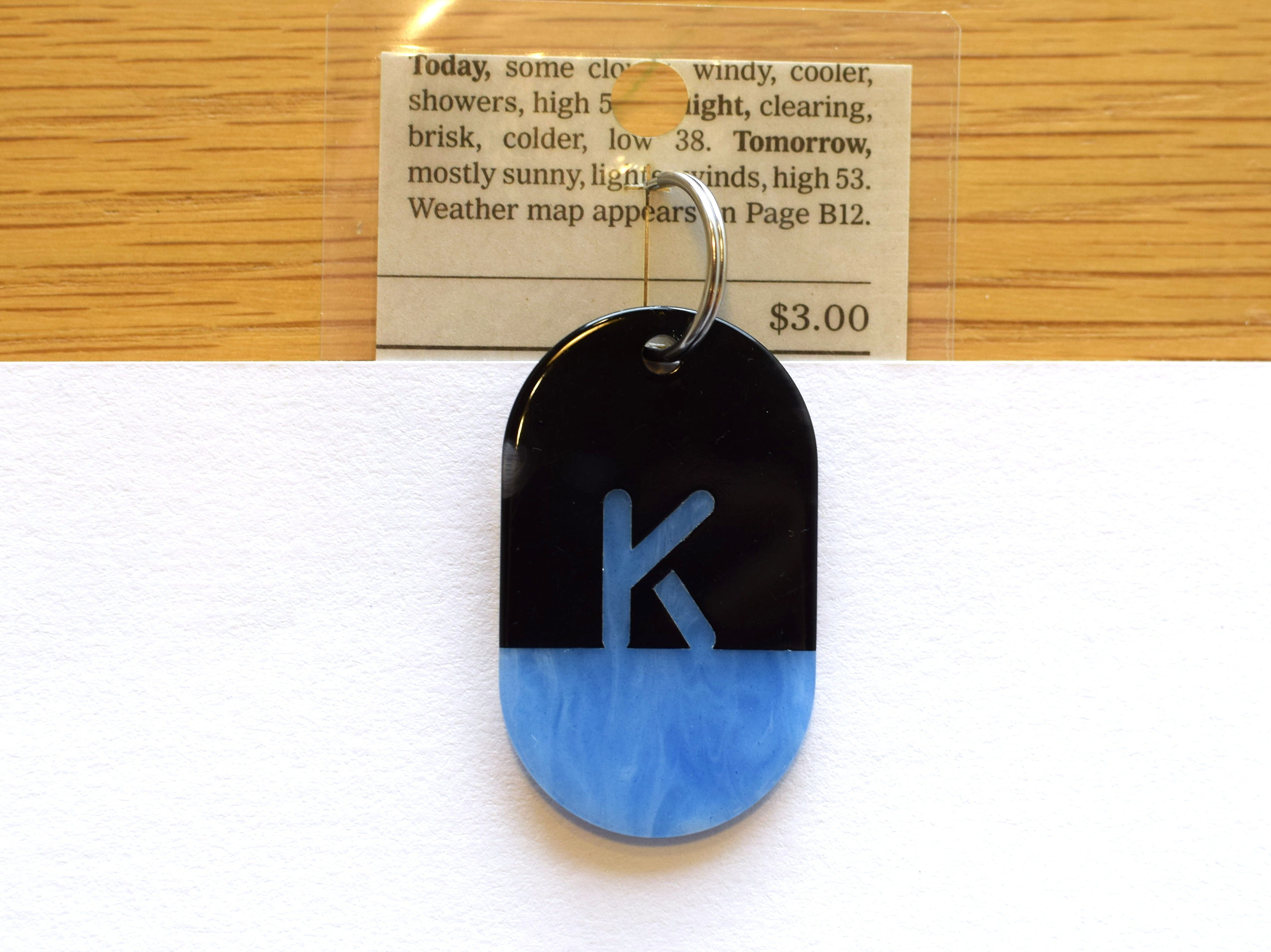 色柄が特徴的な装飾端材を使用してつくられたアクリルタグのキーホルダー。