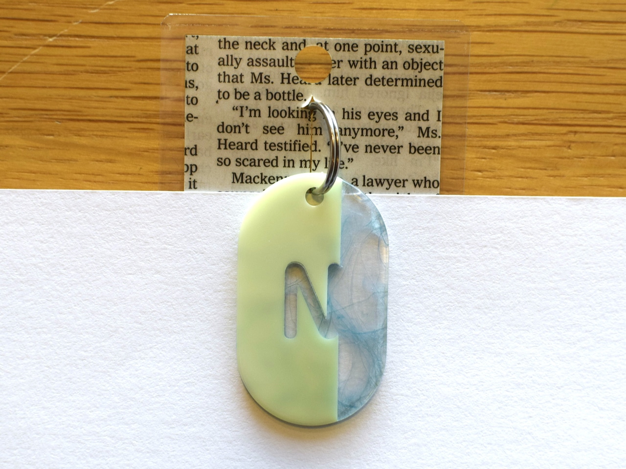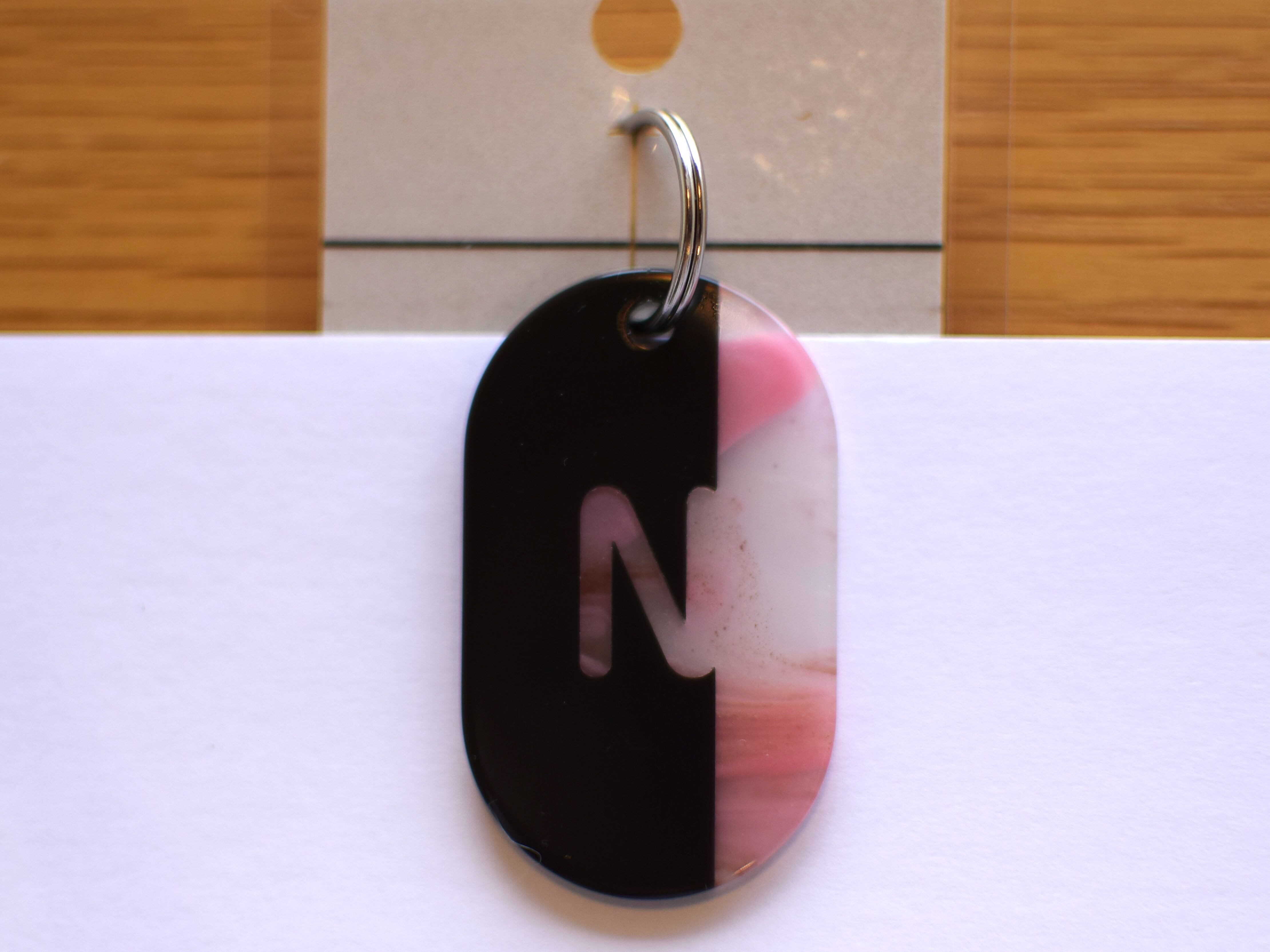 色柄が特徴的な装飾端材を使用してつくられたアクリルタグのキーホルダー。