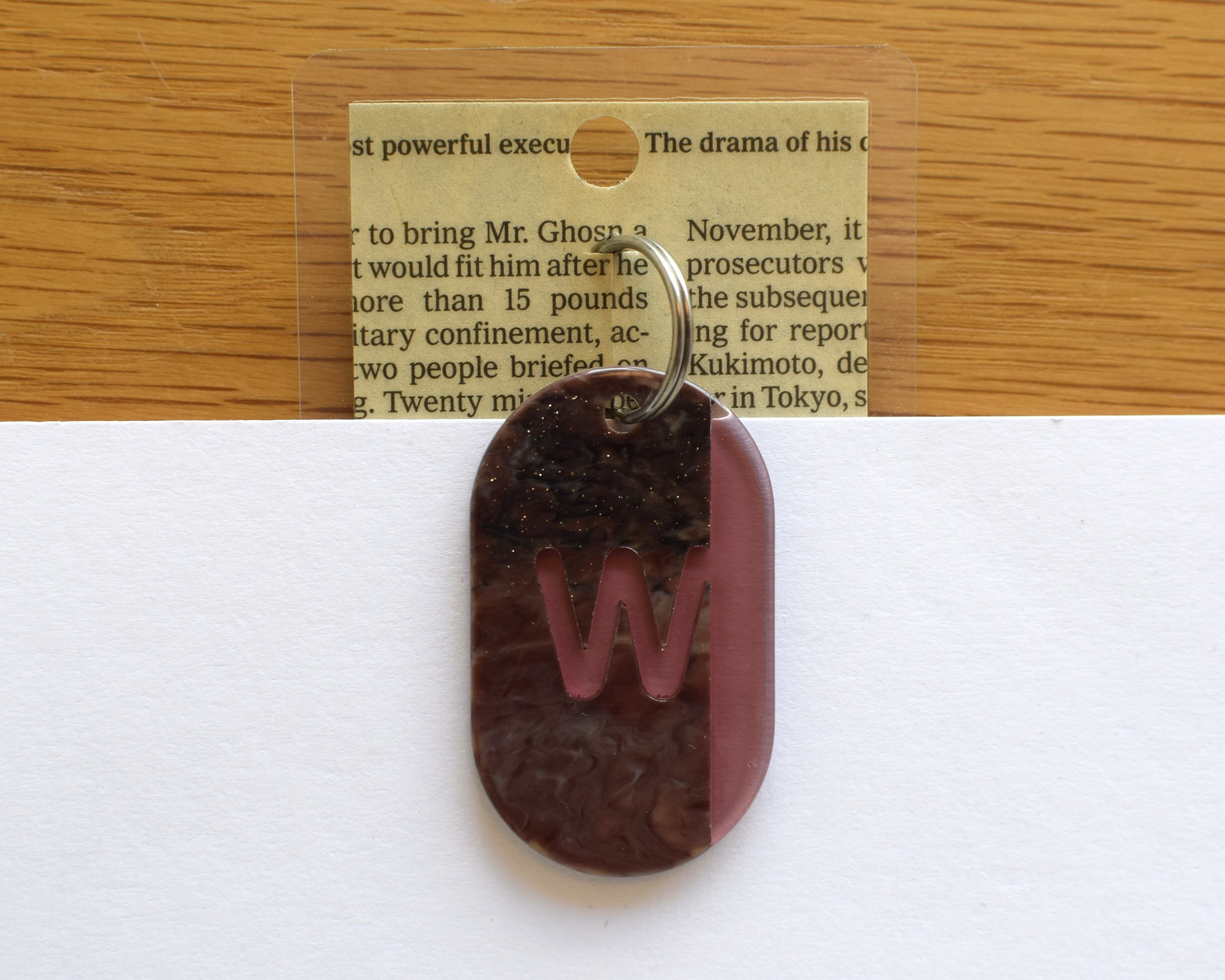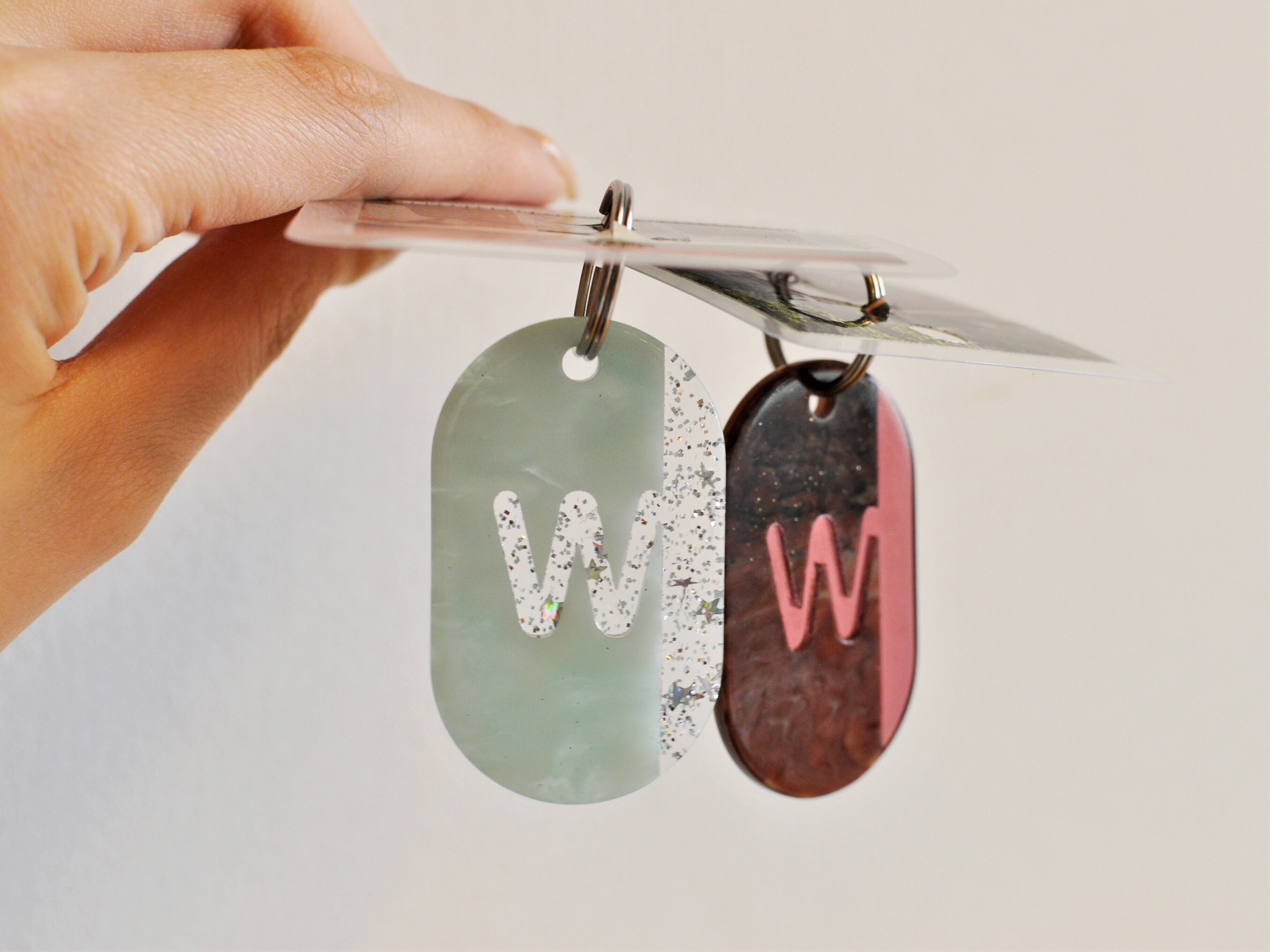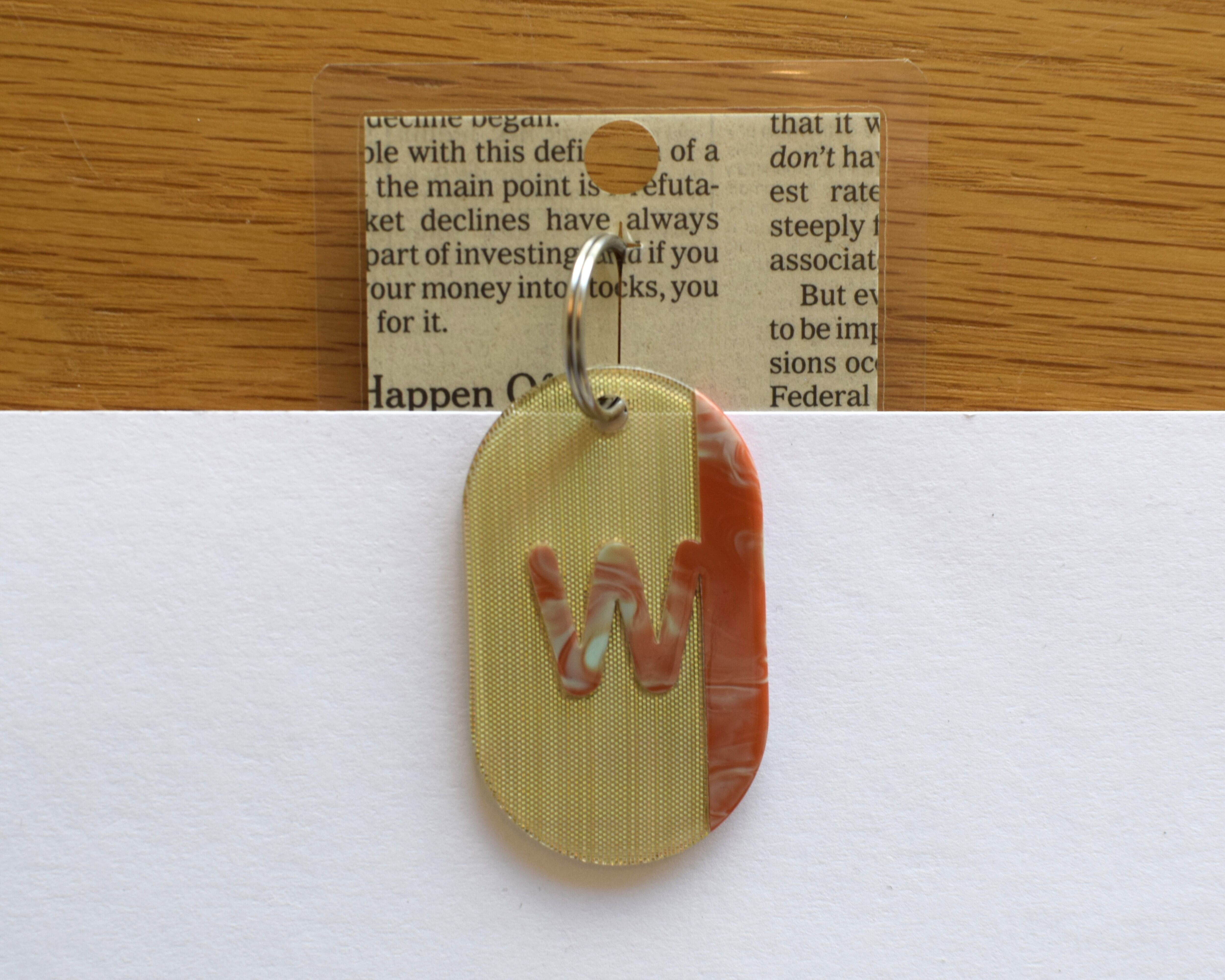 色柄が特徴的な装飾端材を使用してつくられたアクリルタグのキーホルダー。