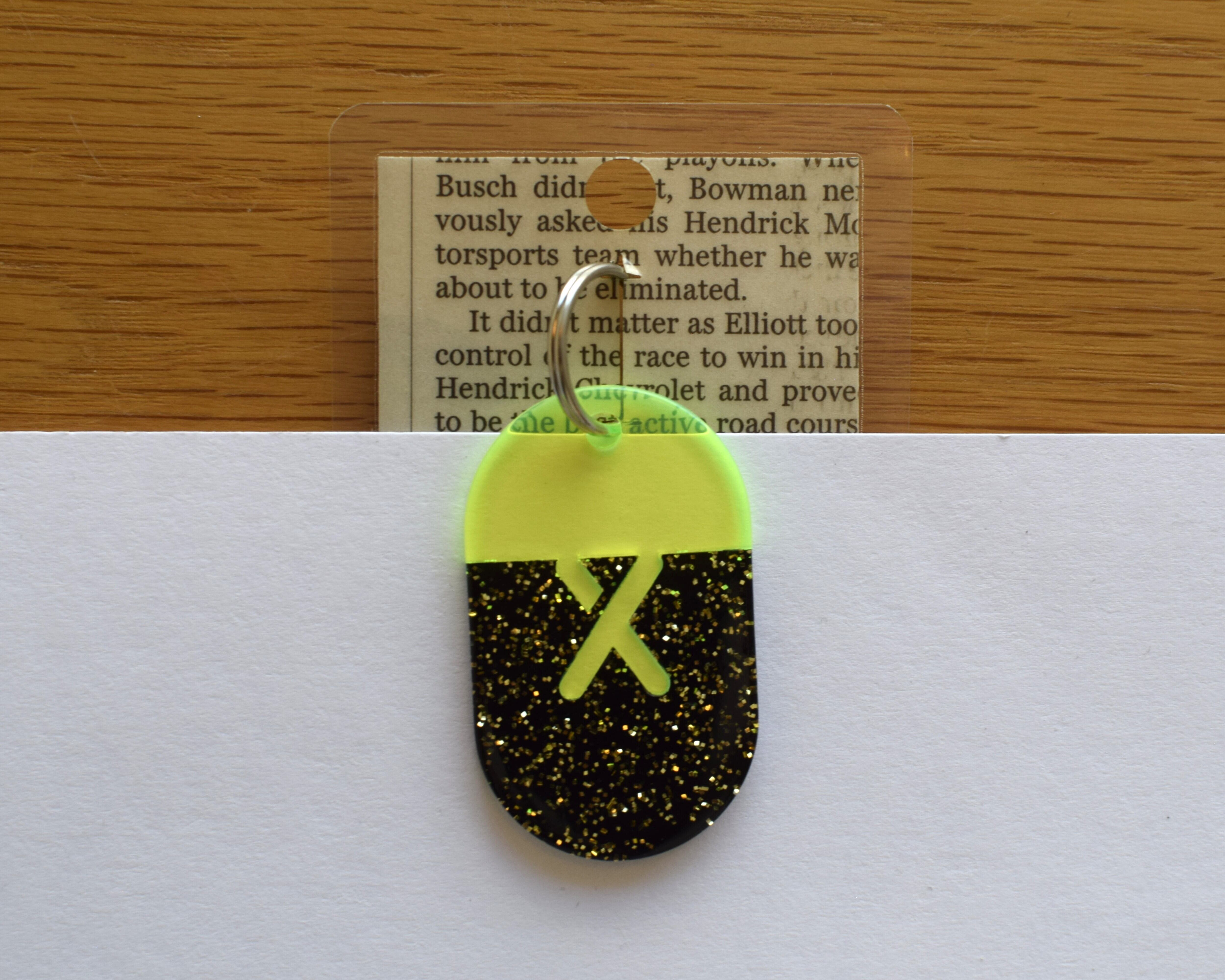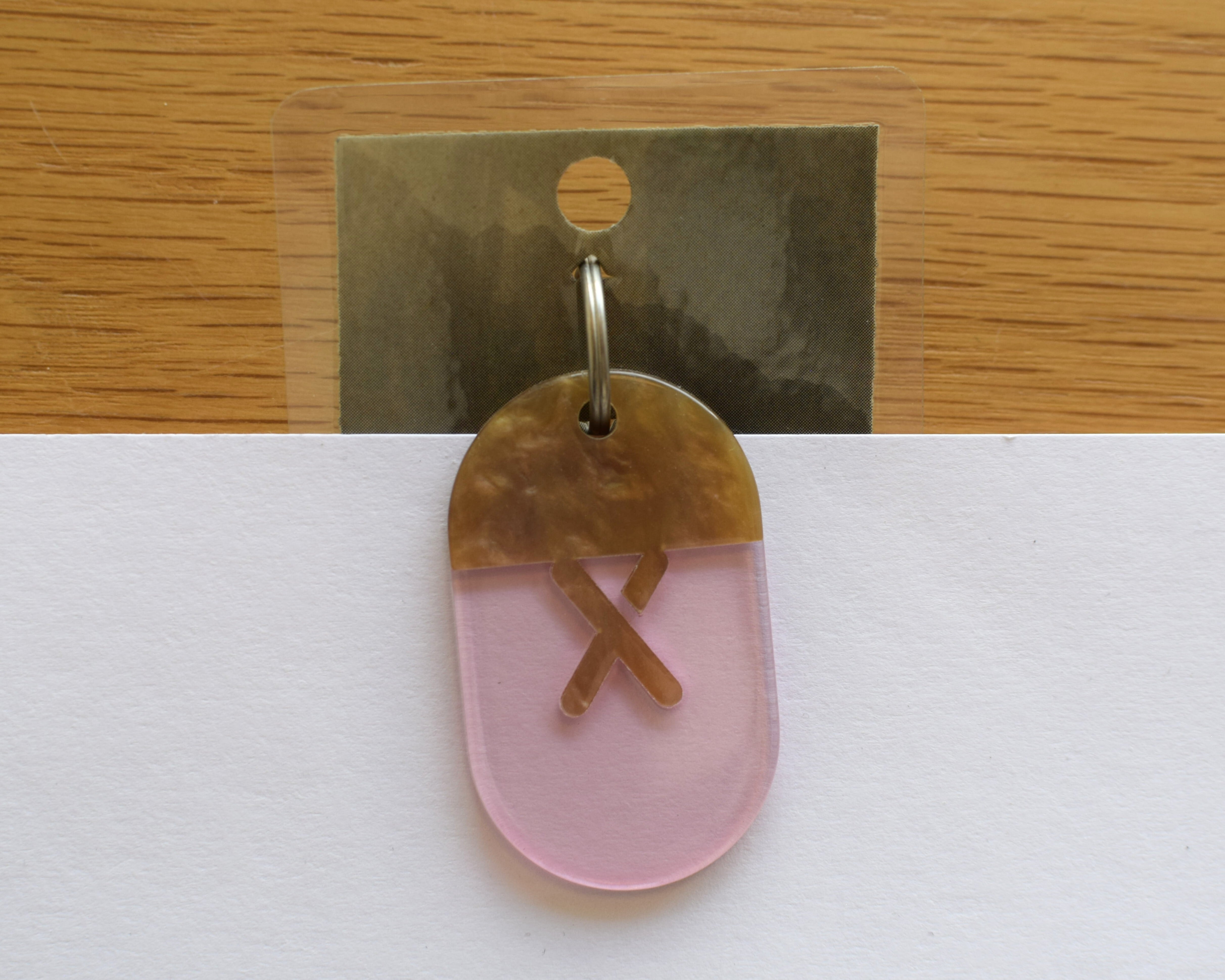 色柄が特徴的な装飾端材を使用してつくられたアクリルタグのキーホルダー。