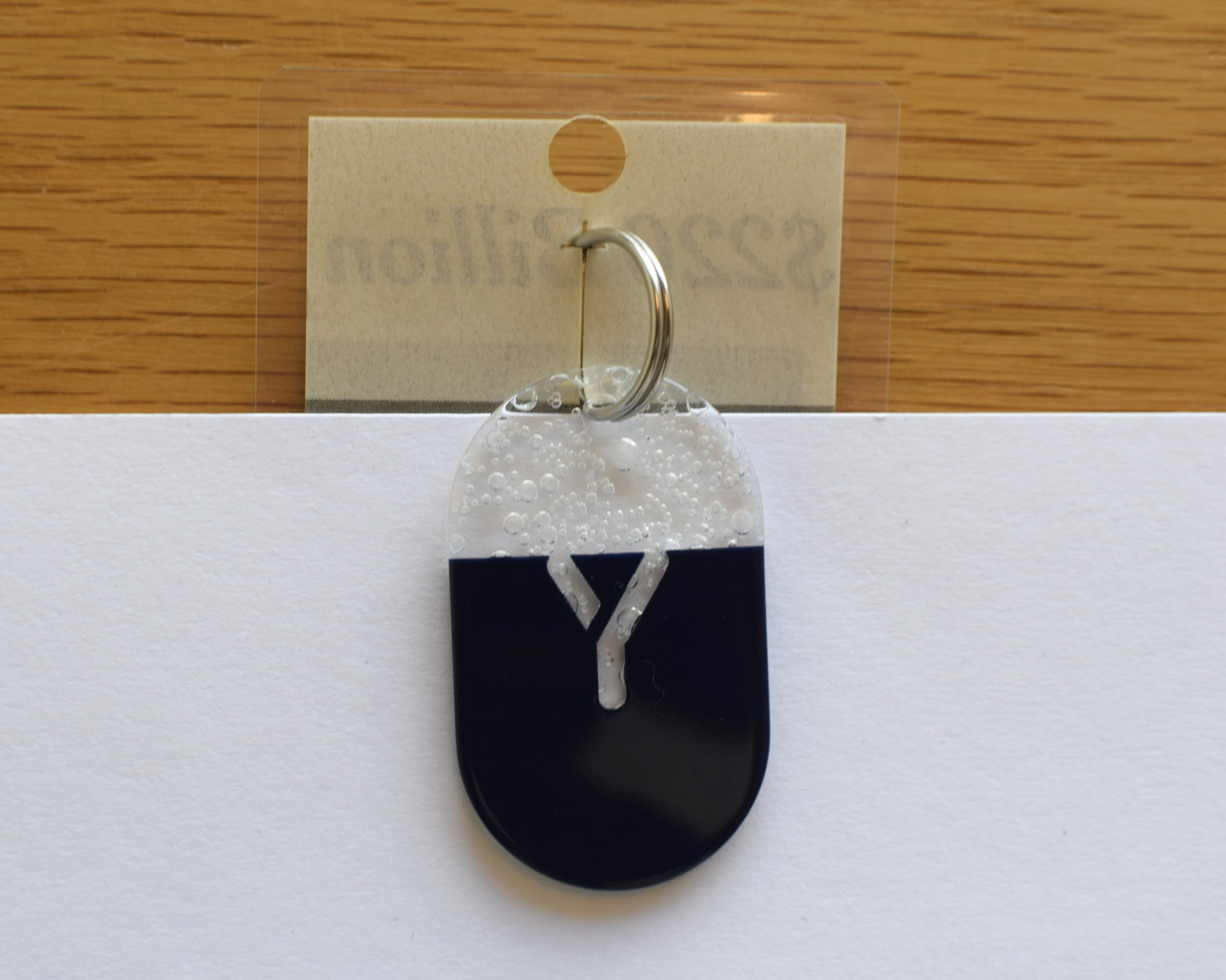 色柄が特徴的な装飾端材を使用してつくられたアクリルタグのキーホルダー。
